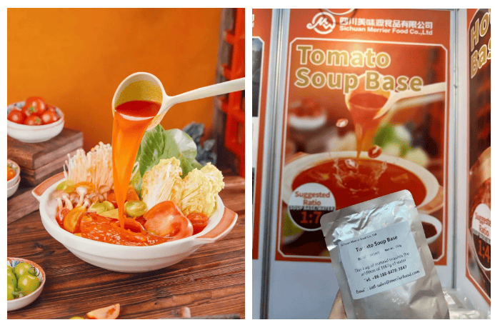 番茄汤—跨场景的万能汤底。采用新疆日照番茄,经去皮熬酱+慢炖出沙,保留了果酸的清爽口感与天然鲜的醇厚底味,色彩与风味双重吸睛。不仅适合国内火锅、粉面、麻辣烫赛道,更契合海外餐饮需求—欧洲采购商现场品鉴后表示:“这款番茄汤煮牛肉、搭配意面都好吃,能直接复用在门店里,省了很多时间成本。”